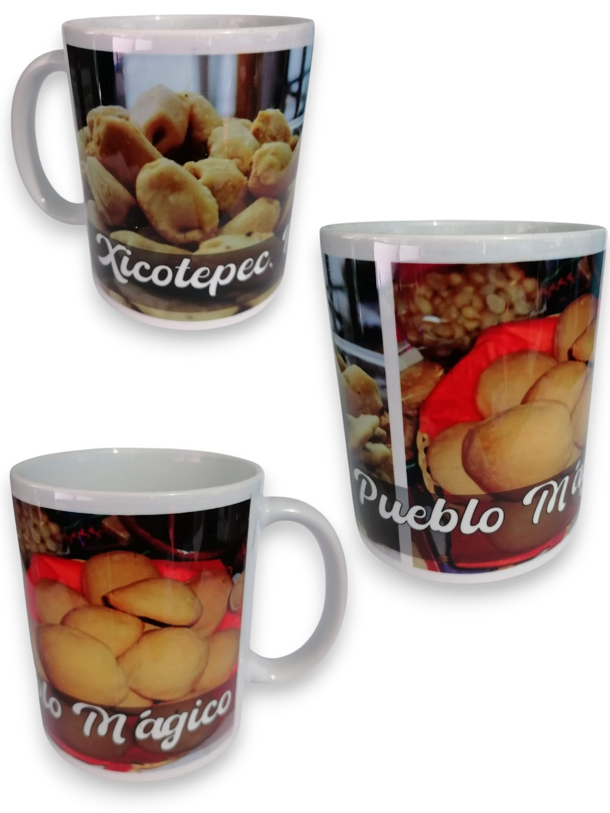 Taza de cerámica con diseño inspirado en la gastronomía típica de Xicotepec, que celebra sus sabores tradicionales como los molotes y galletas esponjadas. Perfecta como recuerdo, regalo o para disfrutar tu bebida favorita con un toque cultural.